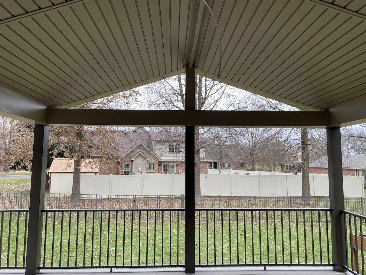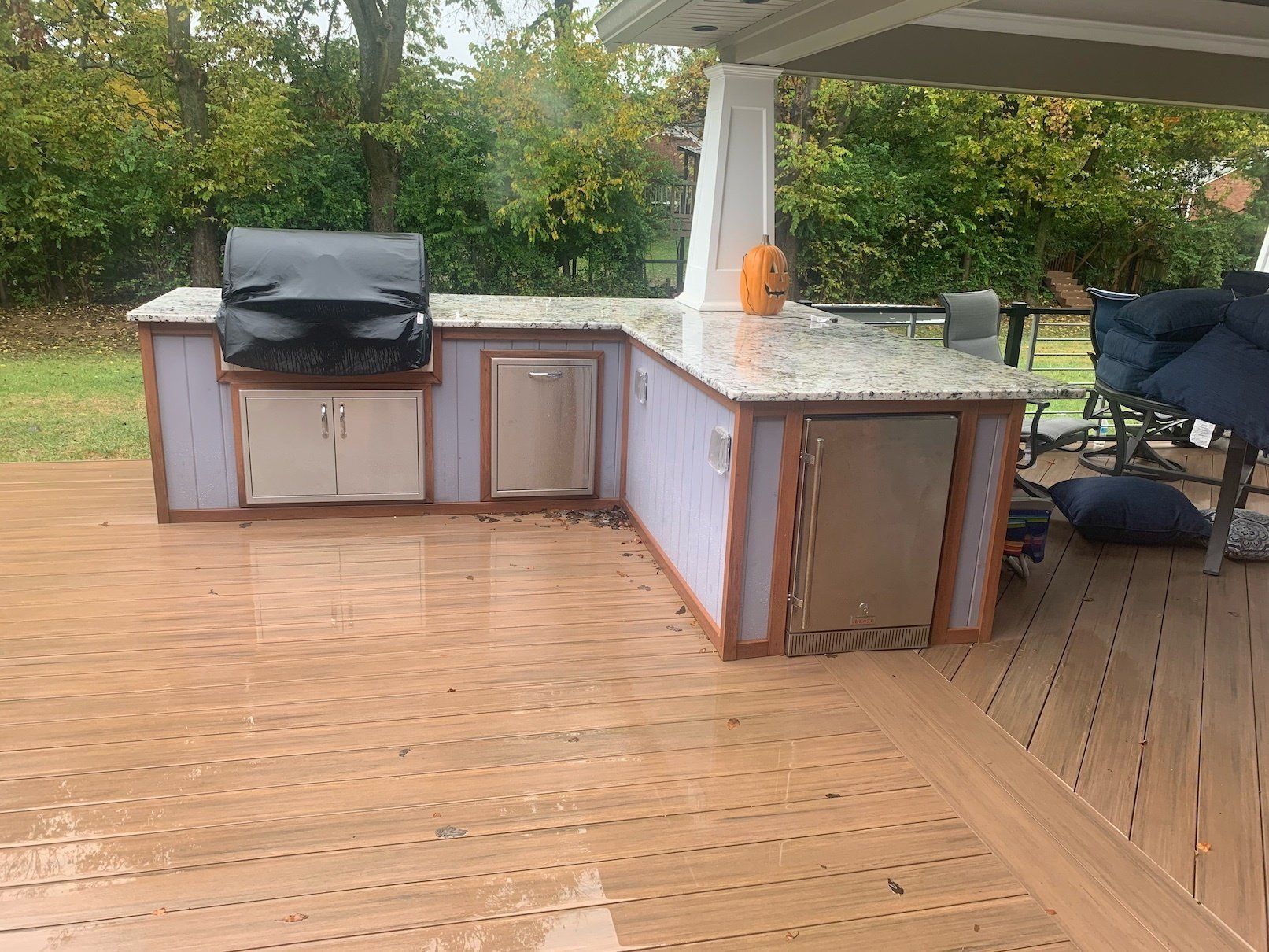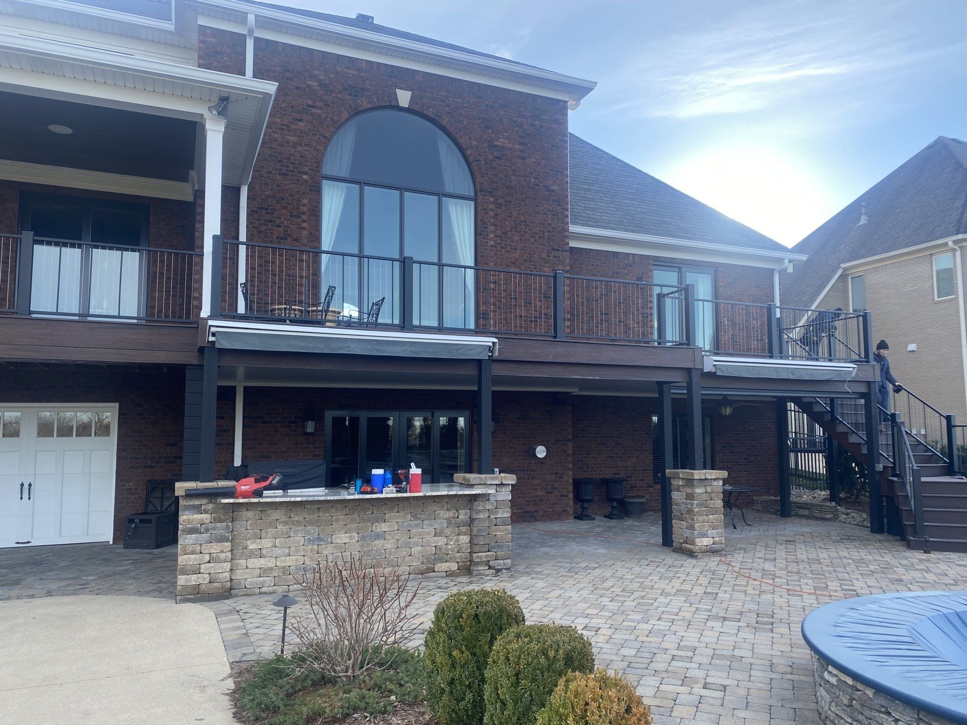 More than 1,000-square-foot deck at Nolin Lake features outdoor kitchen with granite countertop, patio with fire pit, stone work and a roof that soars 30 feet above the concrete. Trex Tiki Torch decking with Westbury C-10 railing. Wood beadboard ceiling.