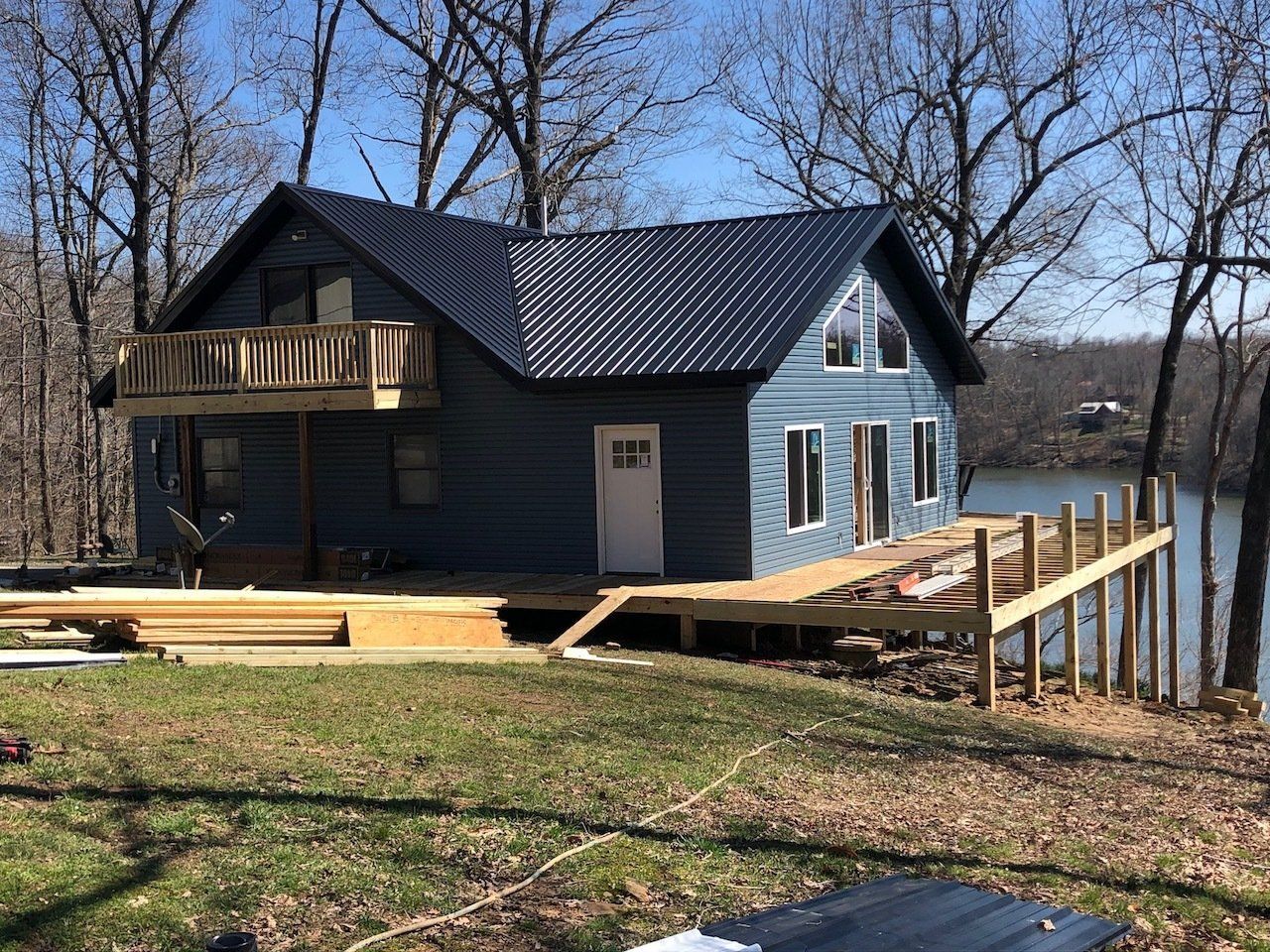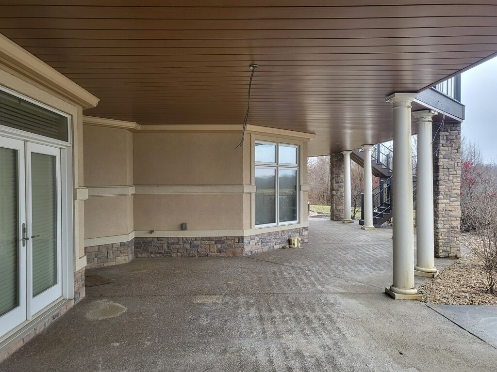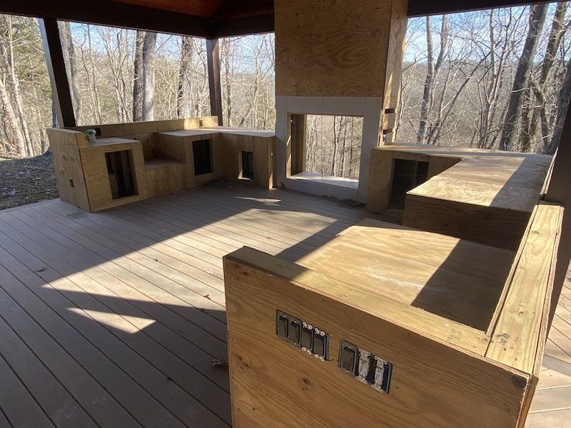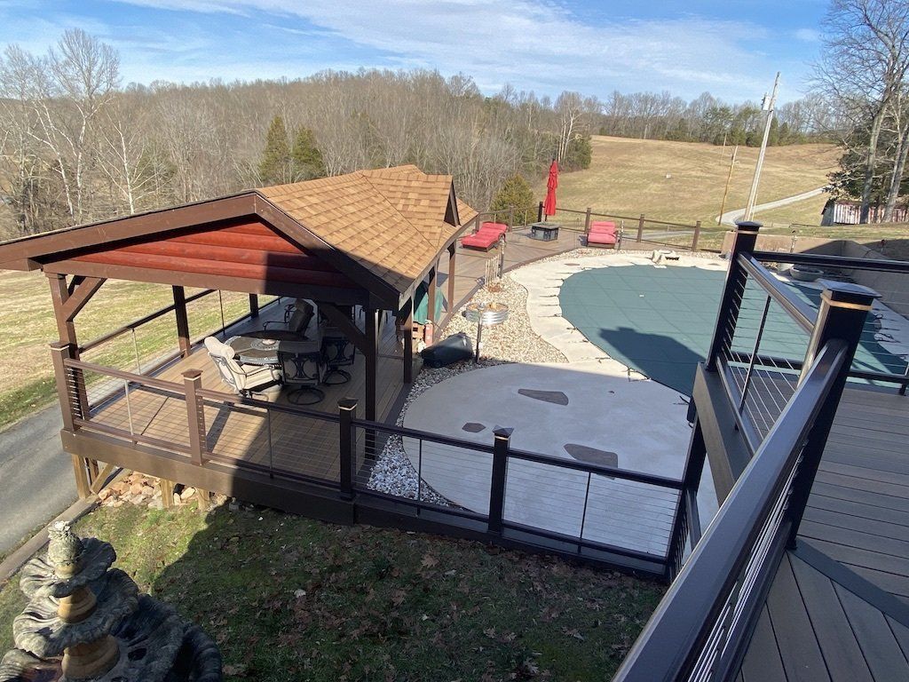 More than 1,000-square-foot deck at Nolin Lake features outdoor kitchen with granite countertop, patio with fire pit, stone work and a roof that soars 30 feet above the concrete. Trex Tiki Torch decking with Westbury C-10 railing. Wood beadboard ceiling.