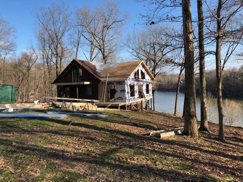 Garage at Nolin Lake is 60 by 50 feet with stonework on the front. Project included concrete driveway and retaining wall.