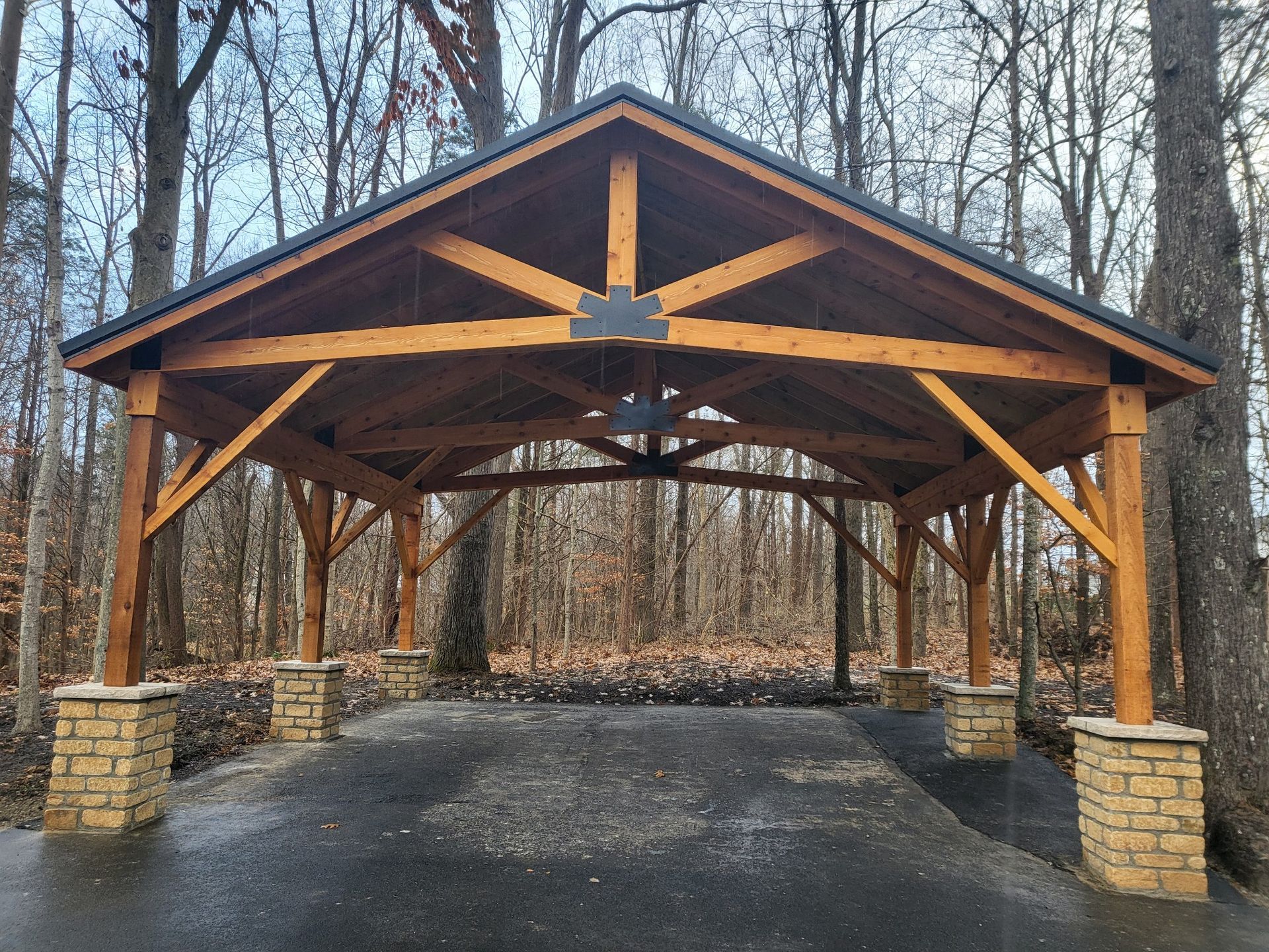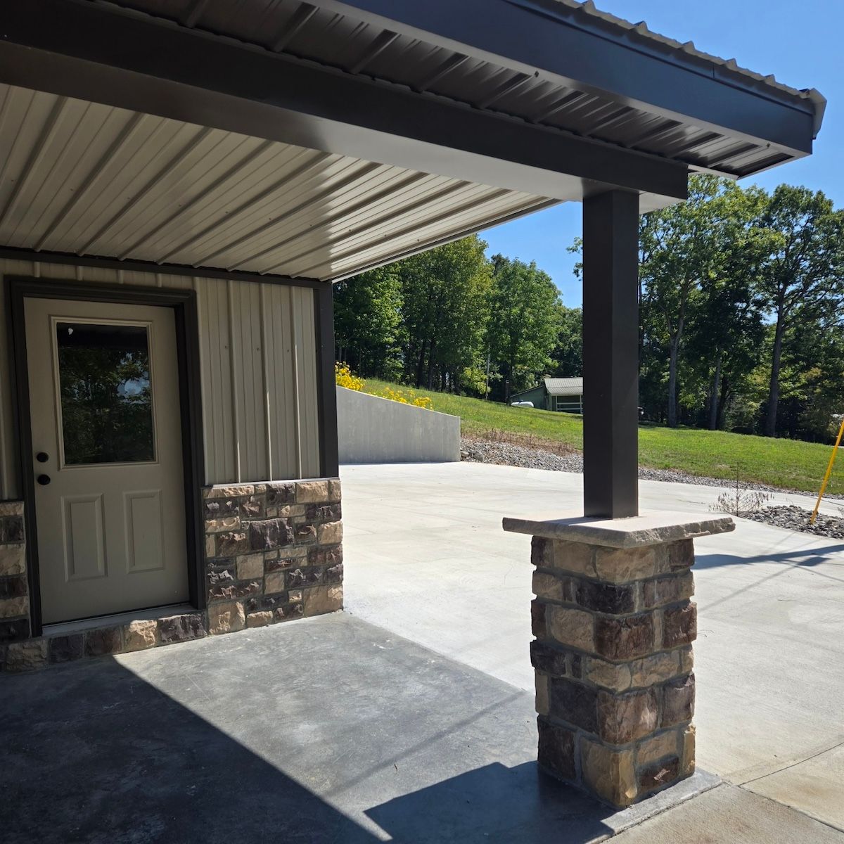 This 24-by-24 foot carport in Louisville features wood trusses wrapped in cedar. We did the stone work, too.