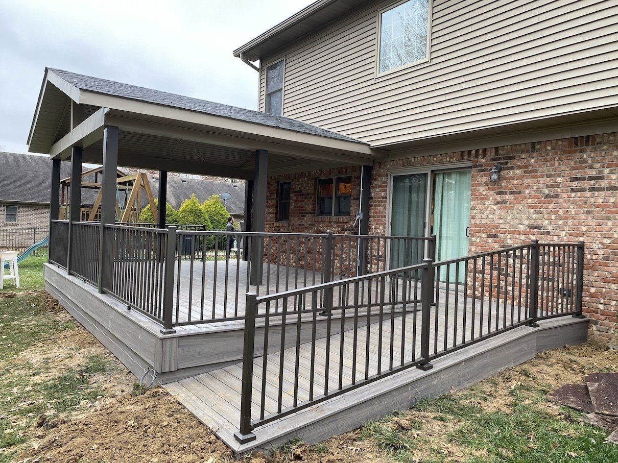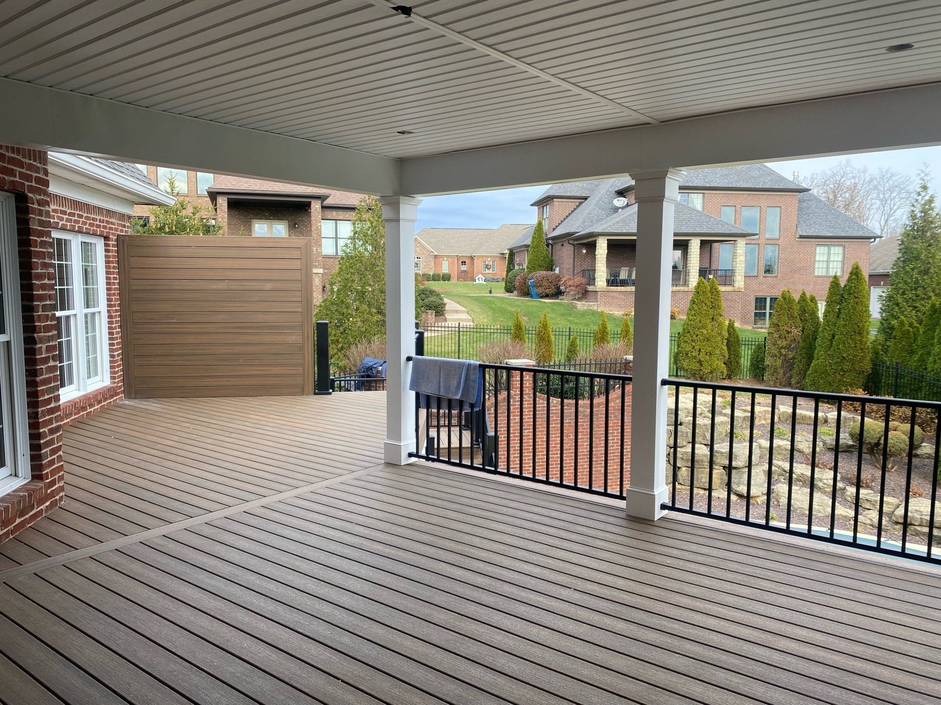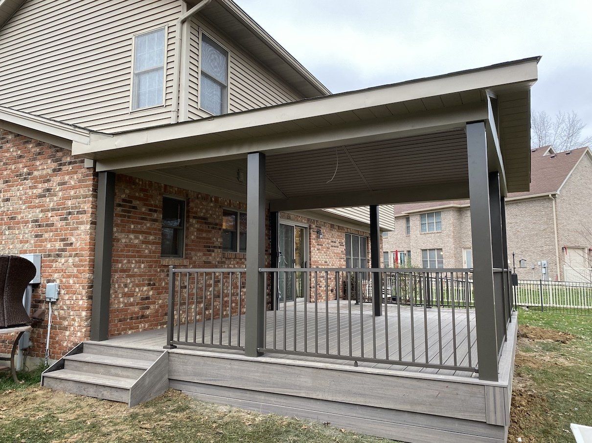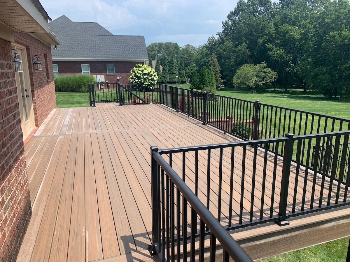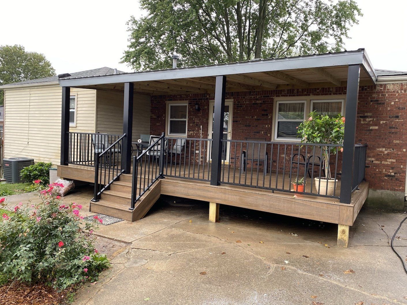 Roofed area of this Louisville deck is 17 by 14 feet. Trex Toasted Sand decking with black Westbury railing, plus Toasted Sand skirting. Also lighting on railing and steps.