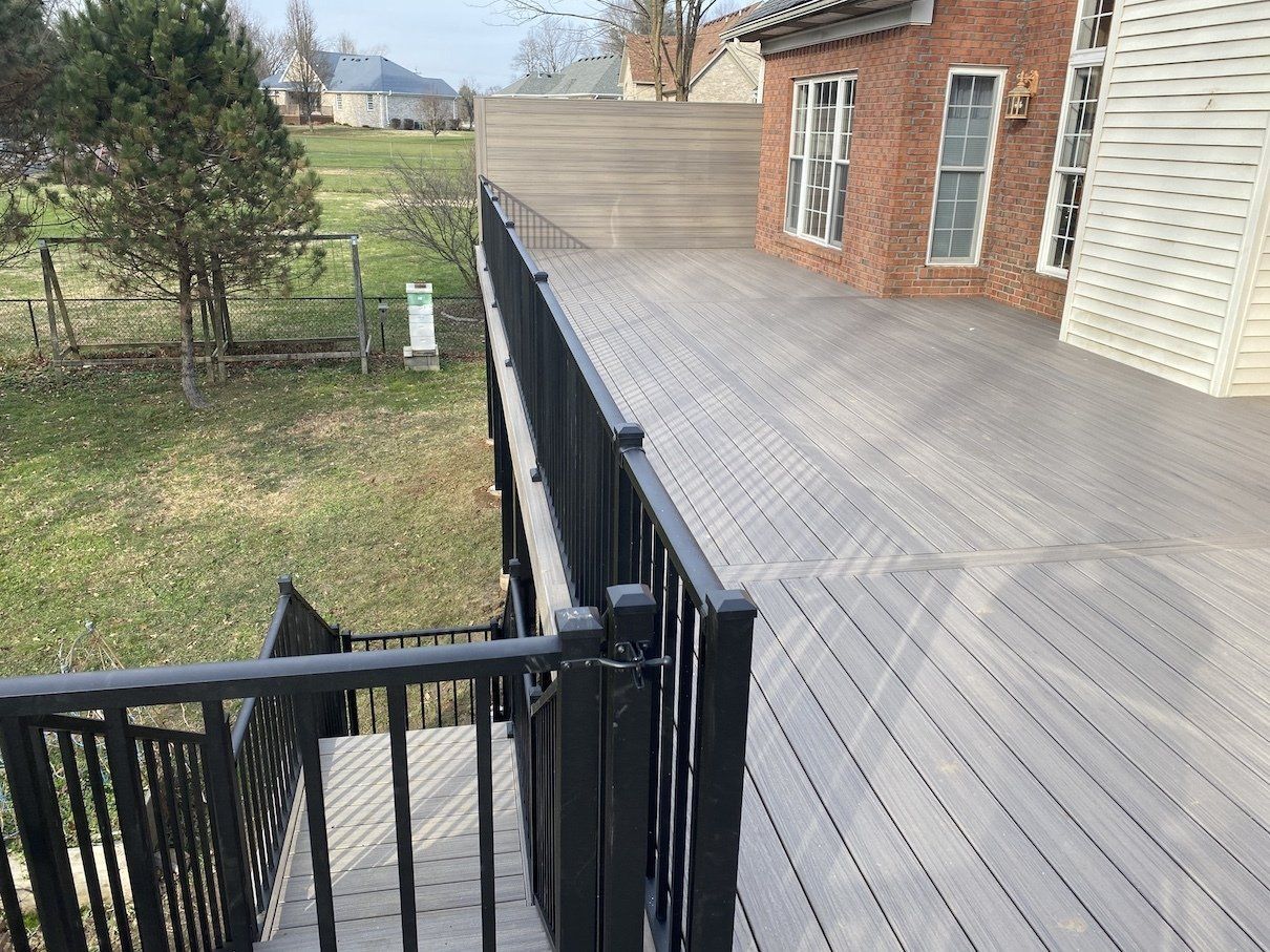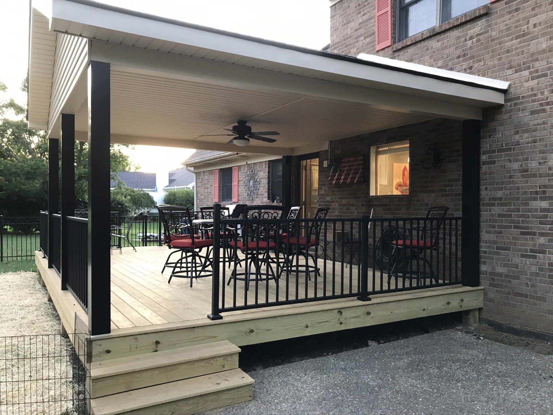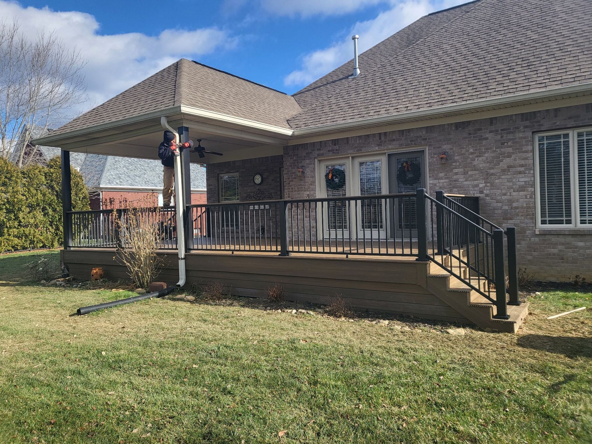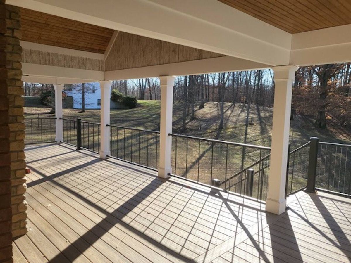 Roofed area of this Louisville deck is 17 by 14 feet. Trex Toasted Sand decking with black Westbury railing, plus Toasted Sand skirting. Also lighting on railing and steps.