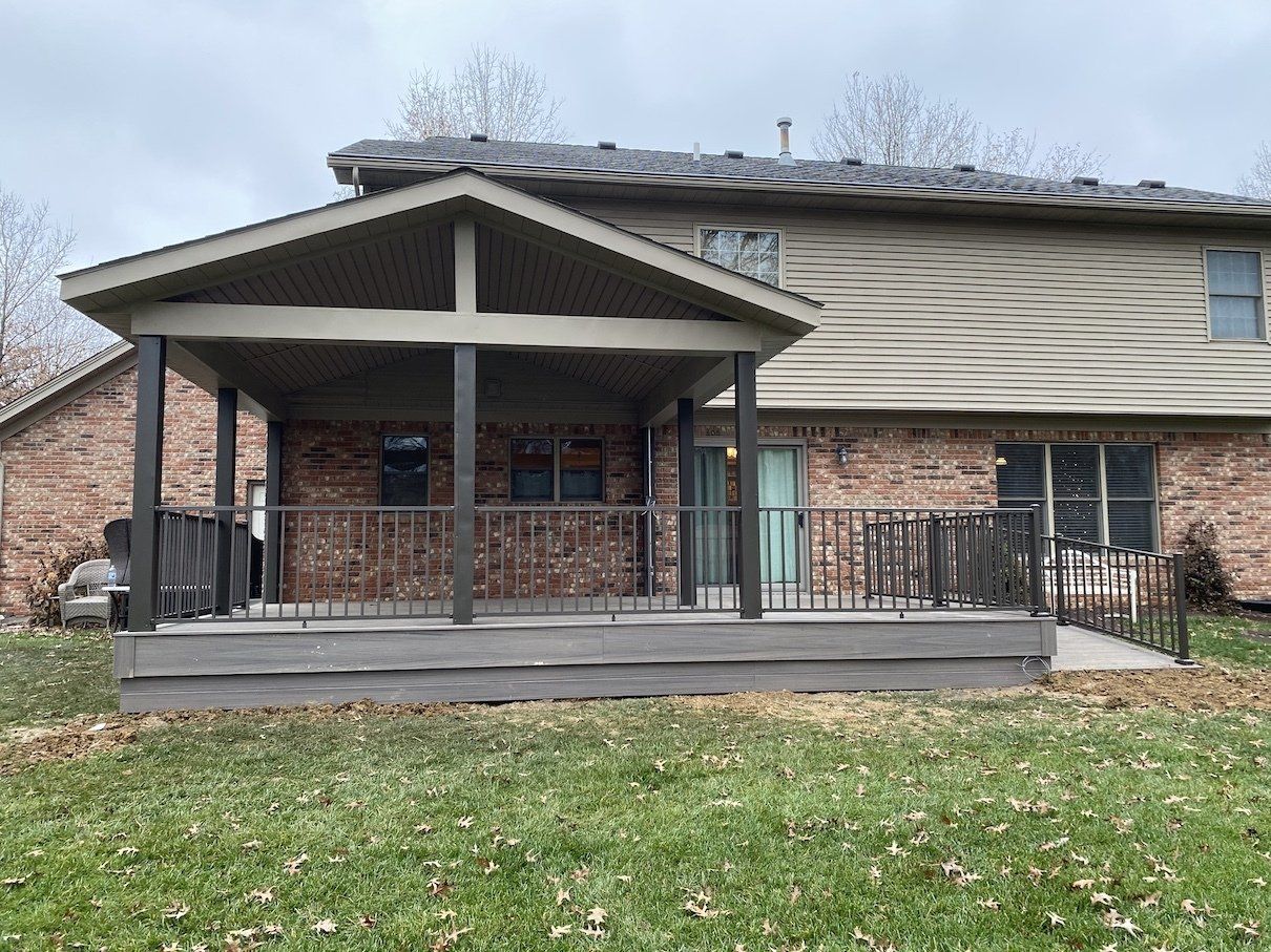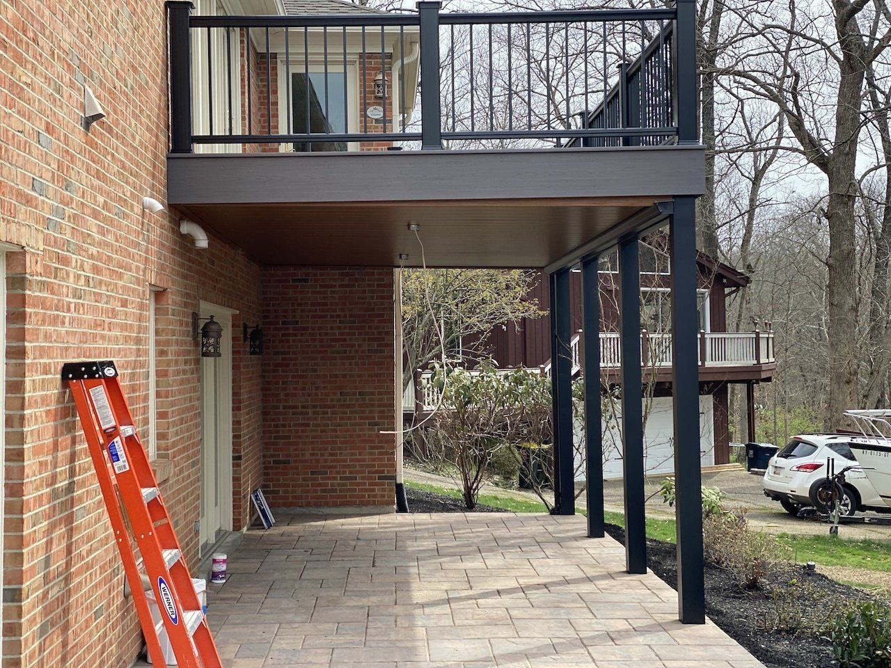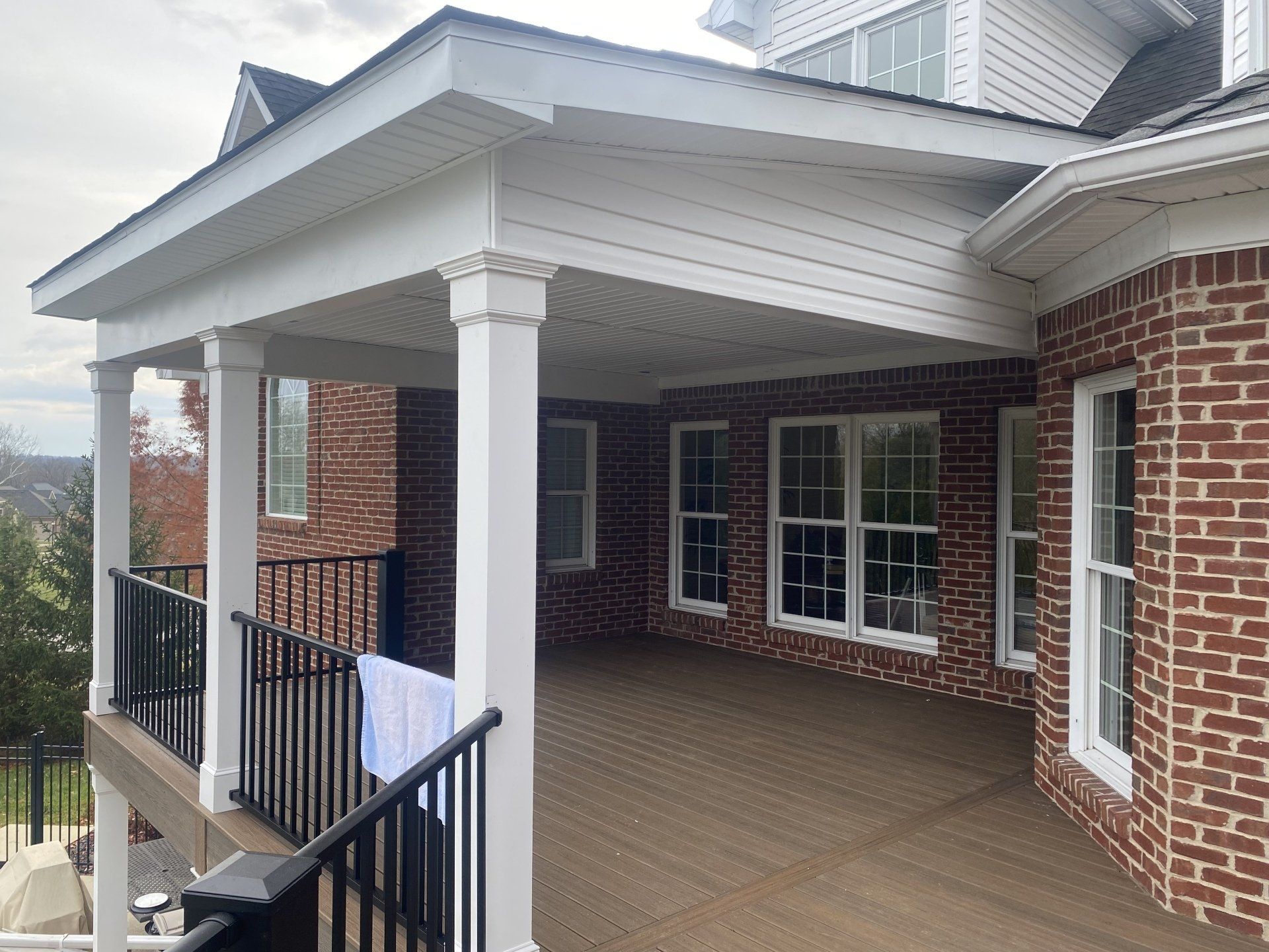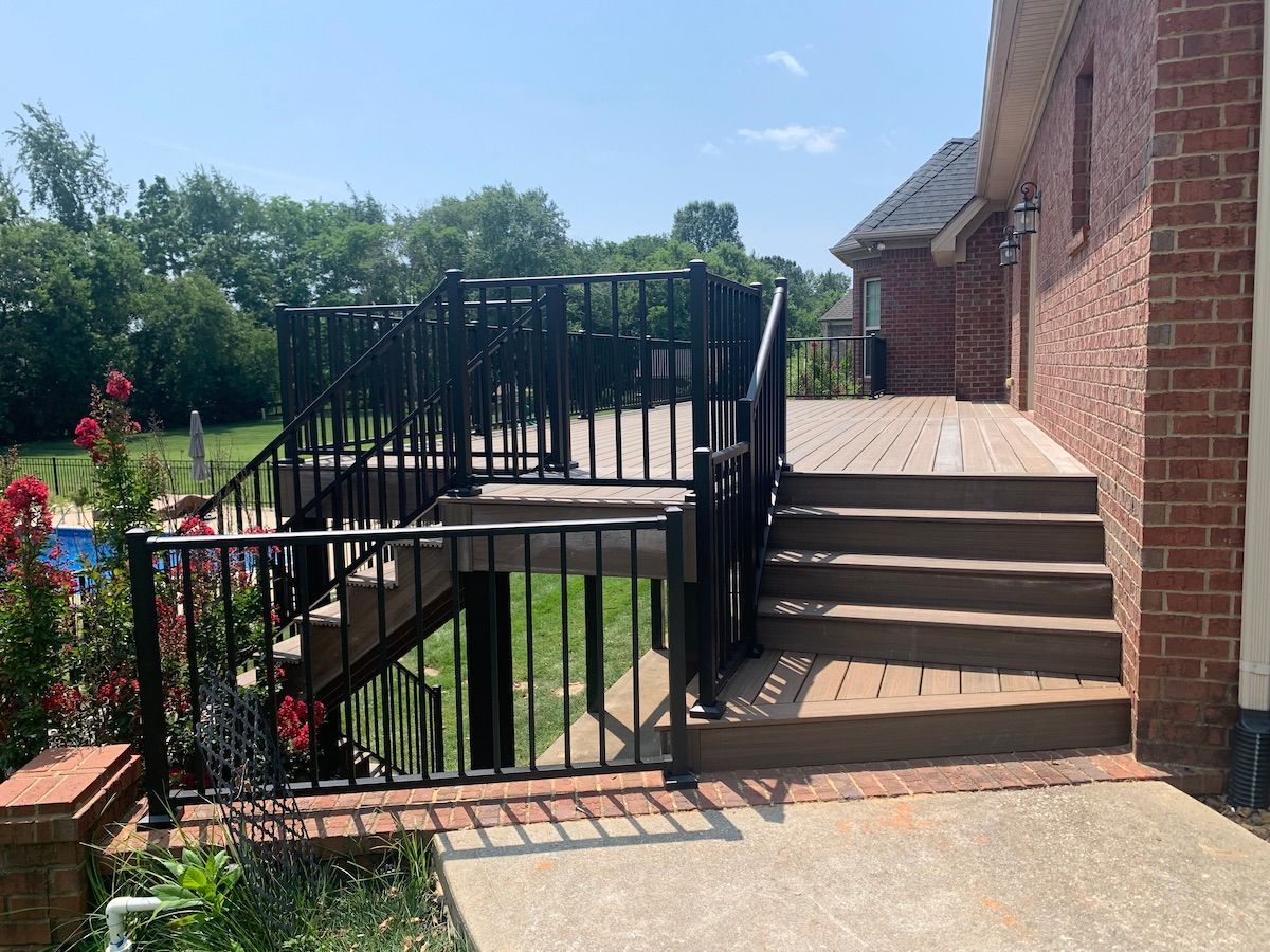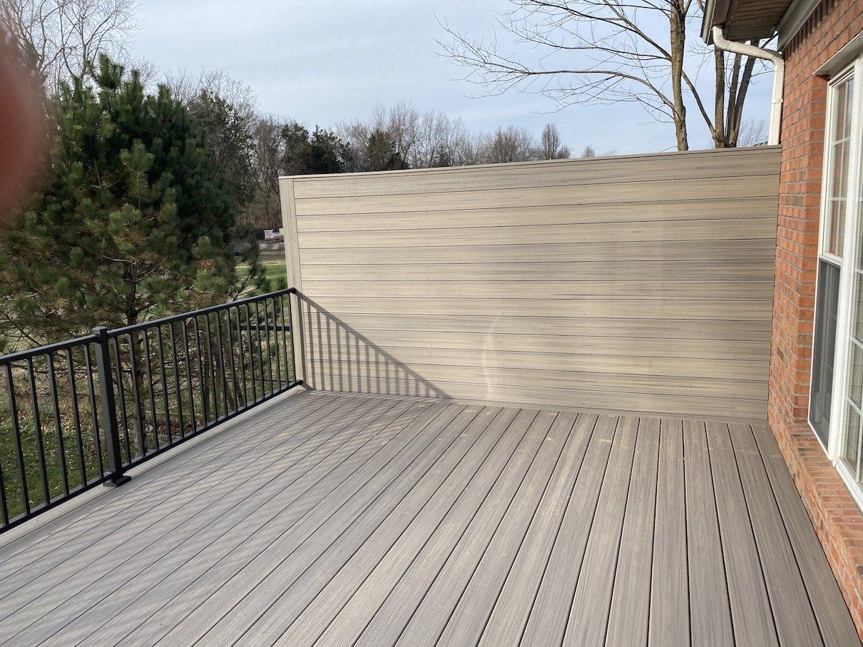 Roofed area of this Louisville deck is 17 by 14 feet. Trex Toasted Sand decking with black Westbury railing, plus Toasted Sand skirting. Also lighting on railing and steps.