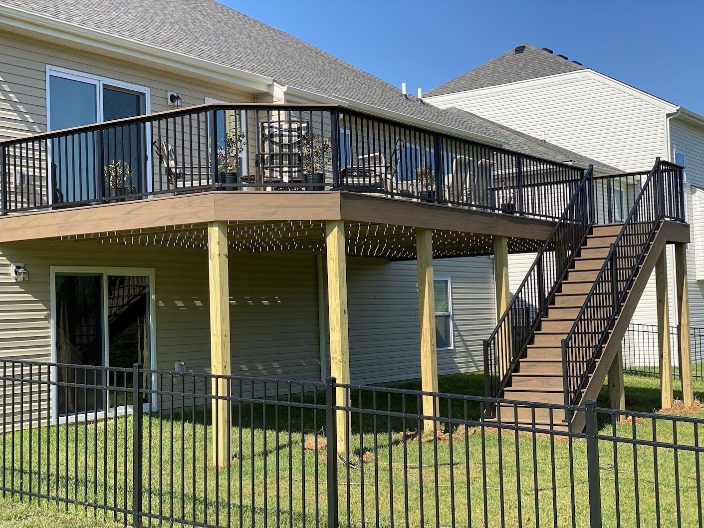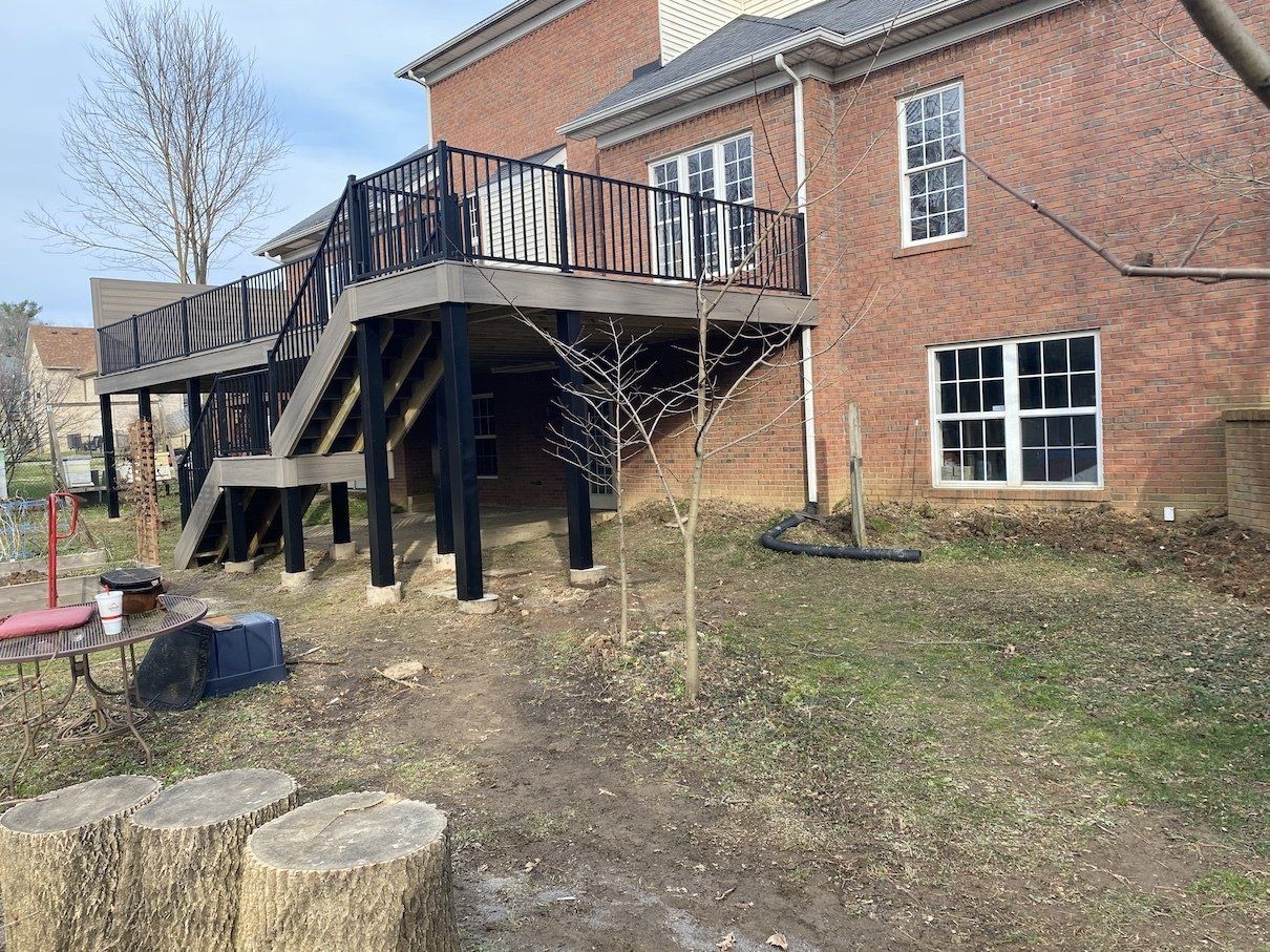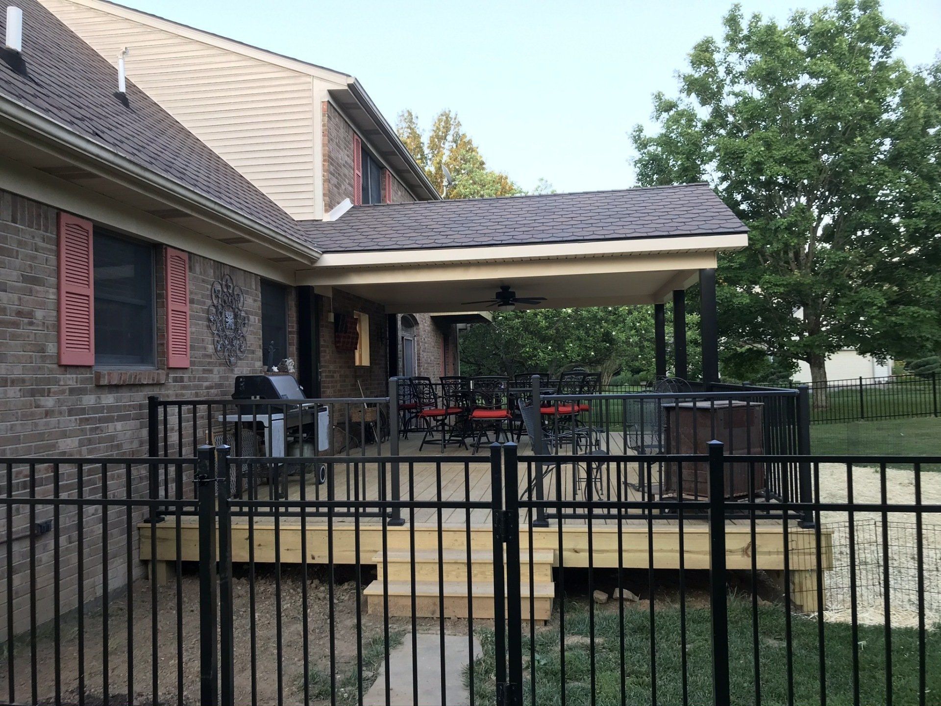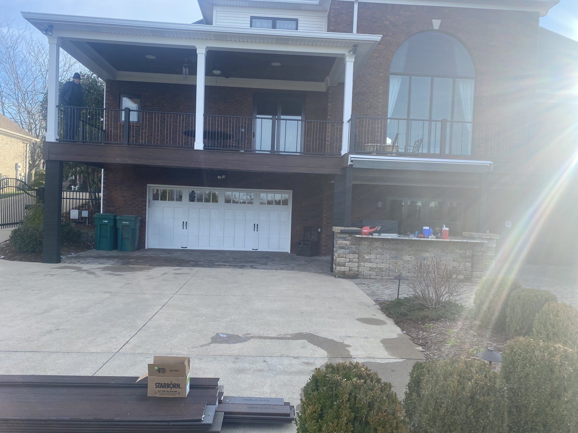 Roofed area of this Louisville deck is 17 by 14 feet. Trex Toasted Sand decking with black Westbury railing, plus Toasted Sand skirting. Also lighting on railing and steps.
