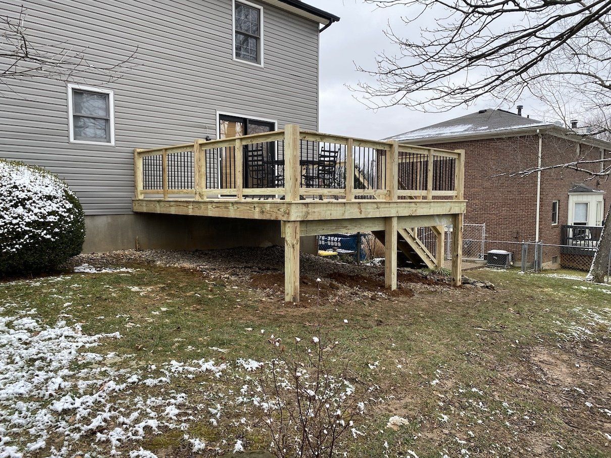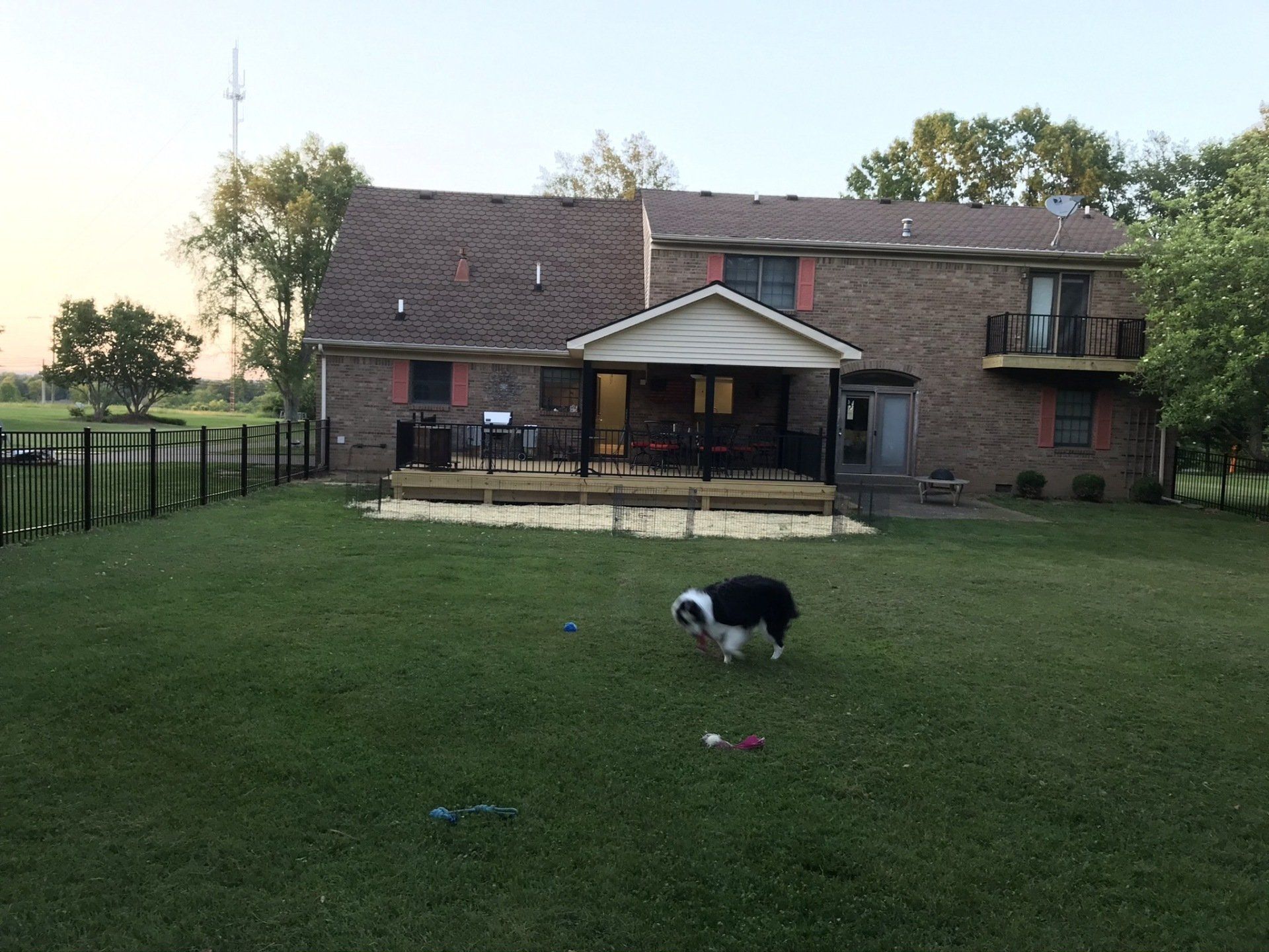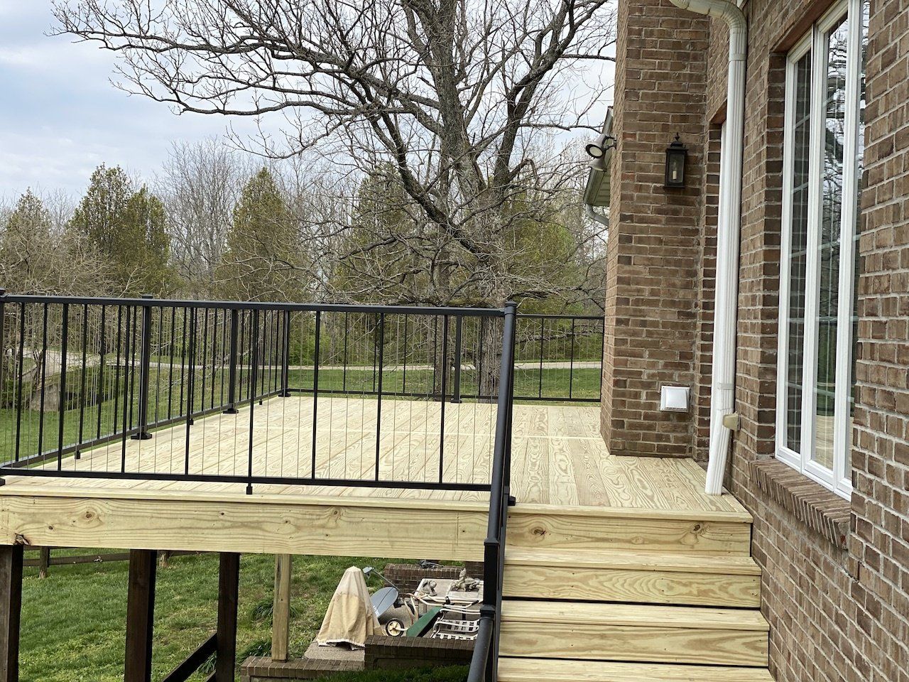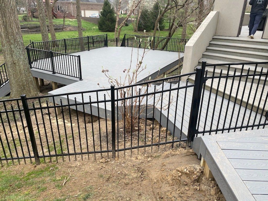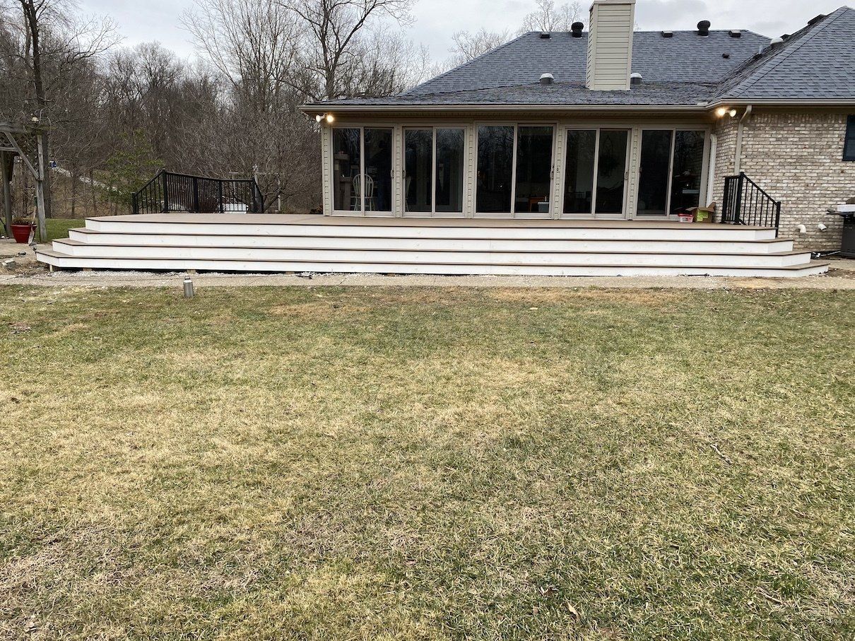 Roofed area of this Louisville deck is 17 by 14 feet. Trex Toasted Sand decking with black Westbury railing, plus Toasted Sand skirting. Also lighting on railing and steps.