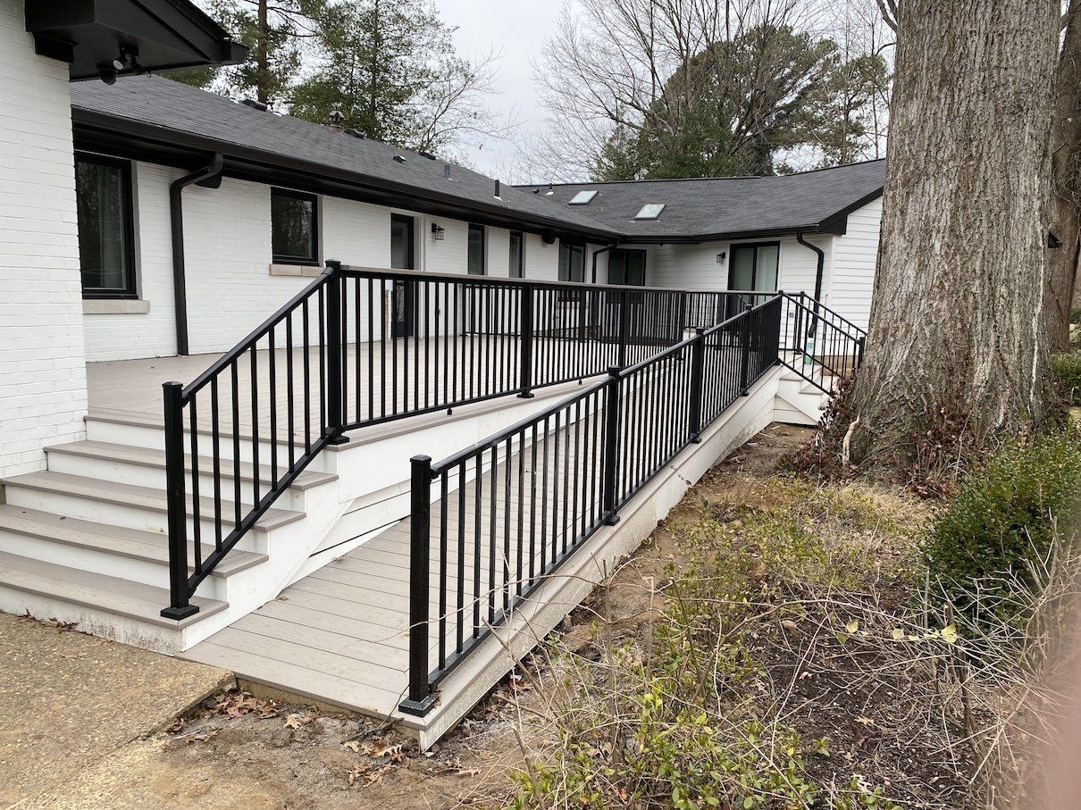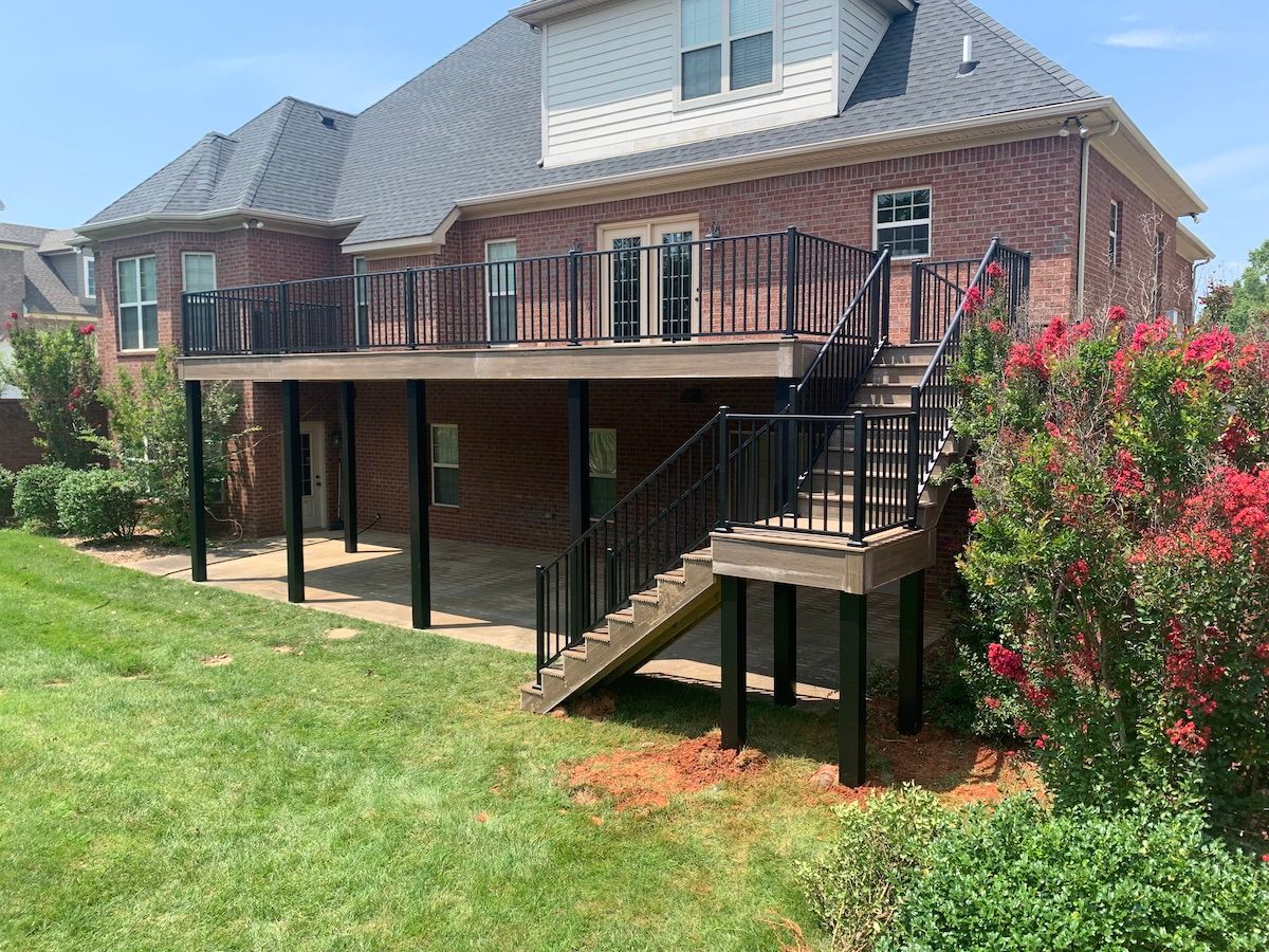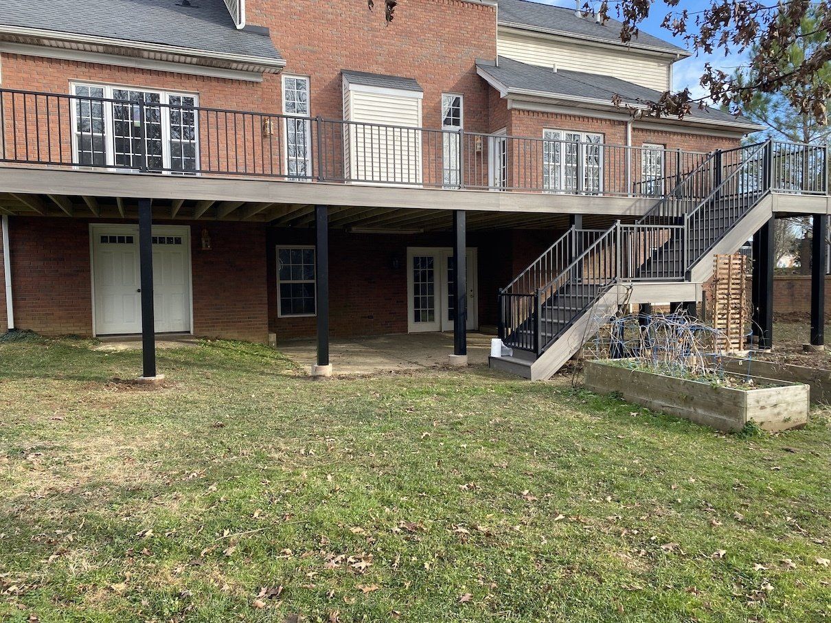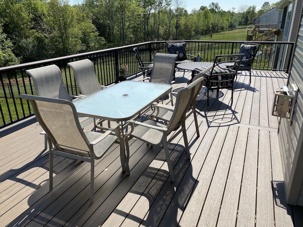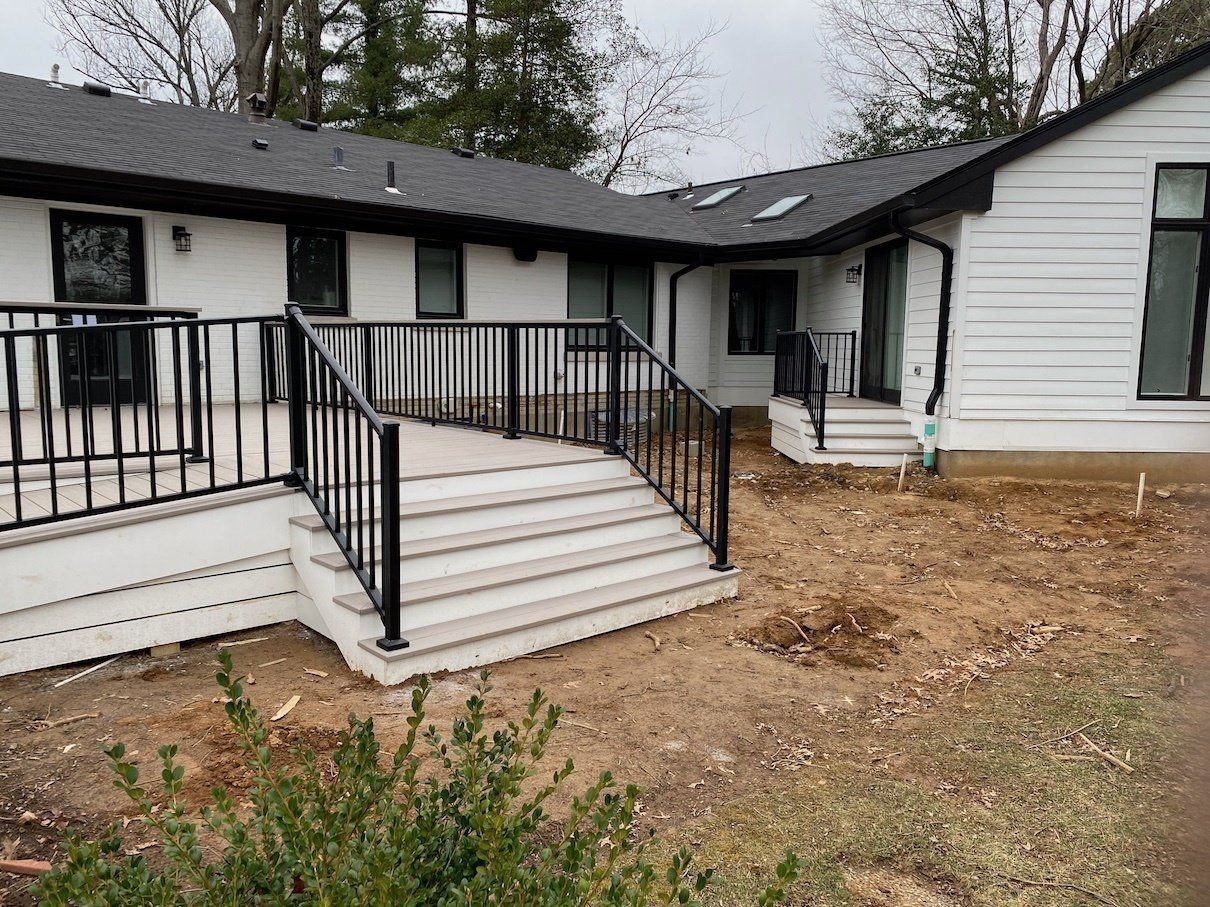 Trex Rocky Harbor decking with Westbury railing. Deck was built to fit under existing roof overhang, giving homeowners a nice retreat from sun and rain.