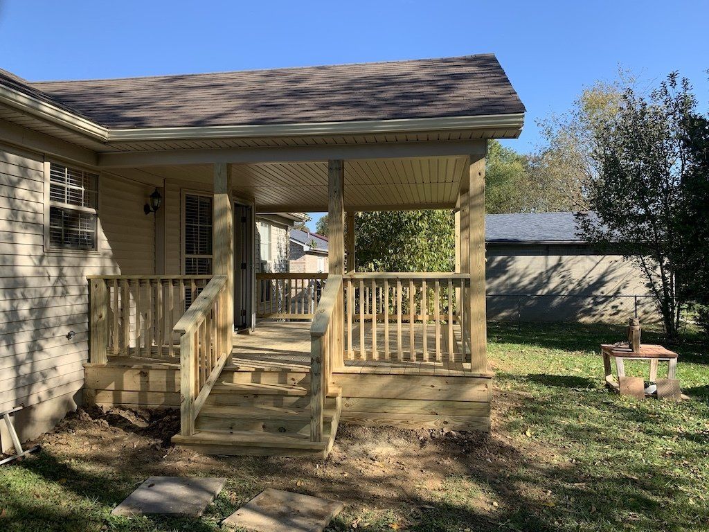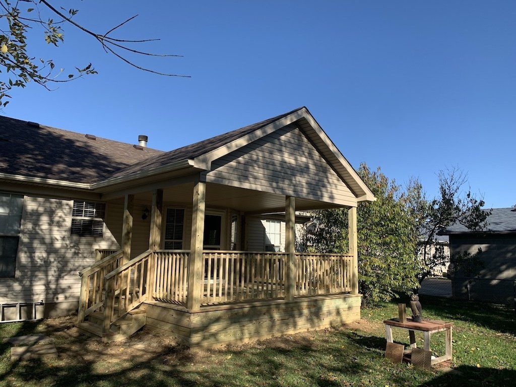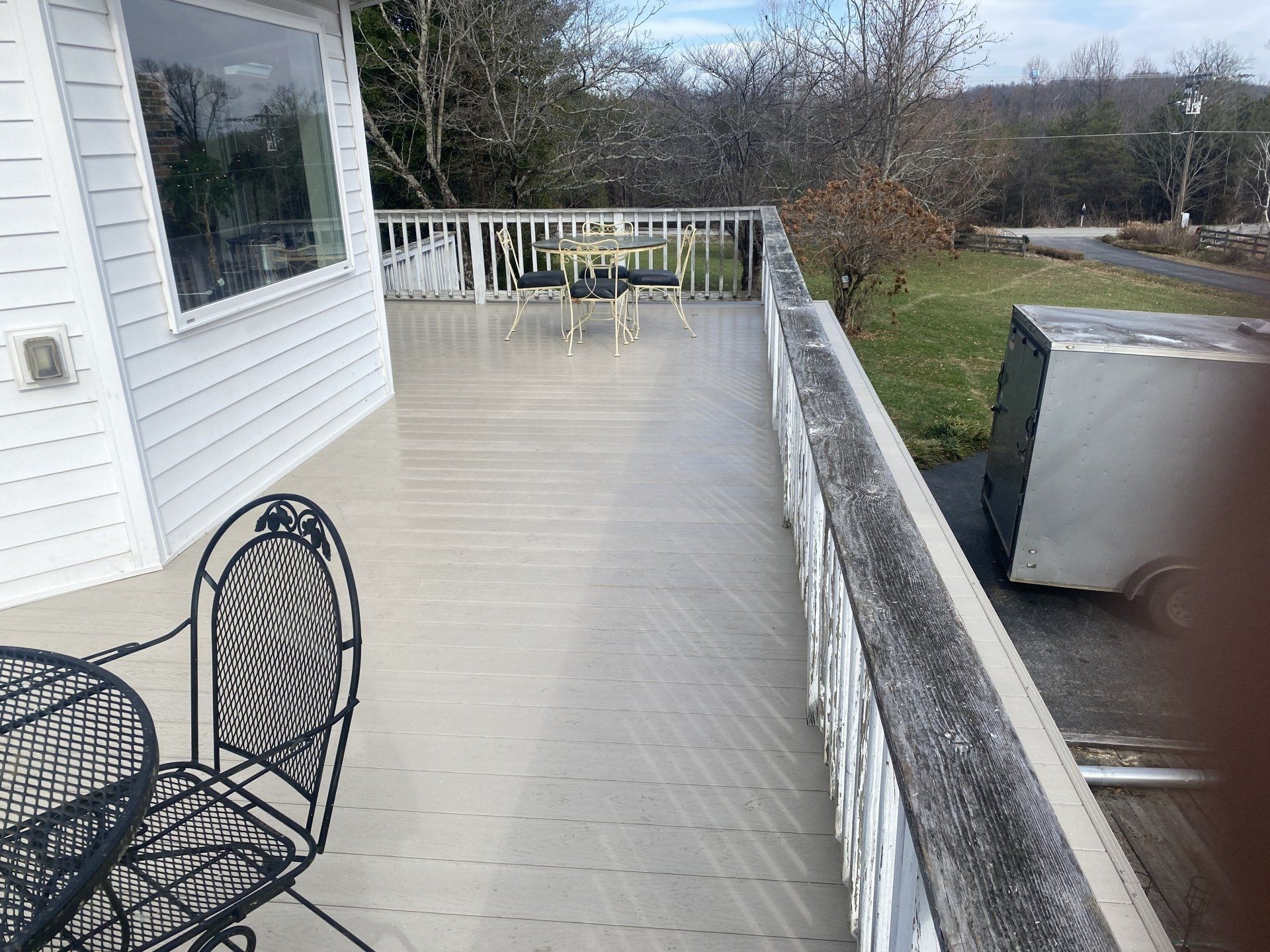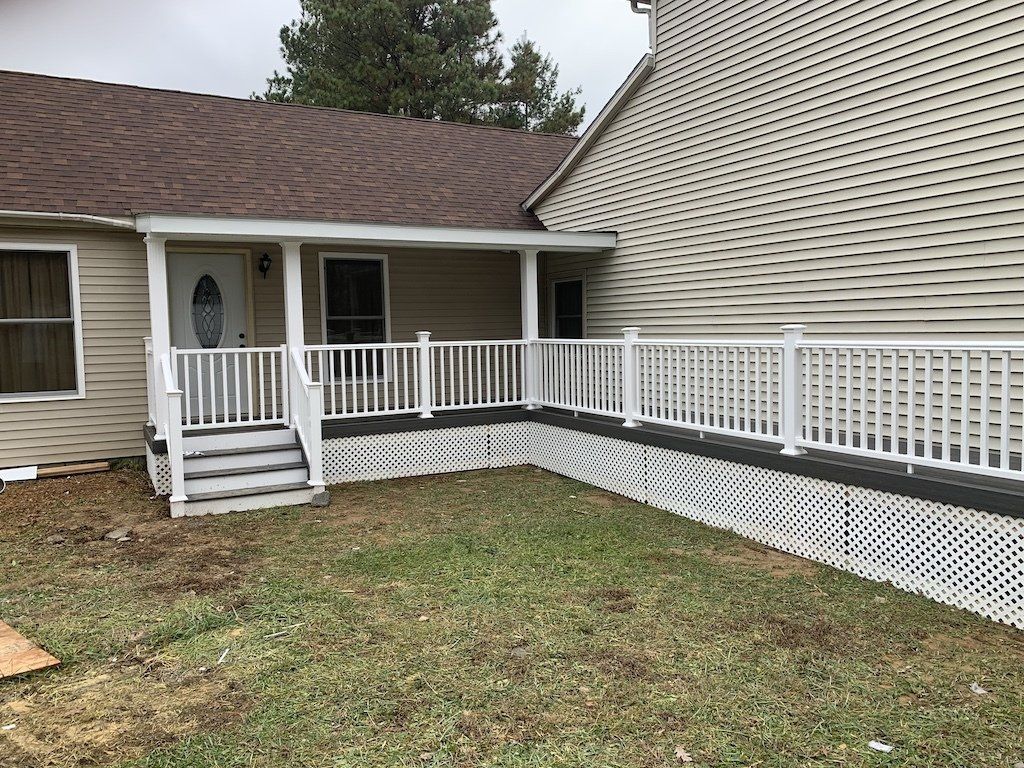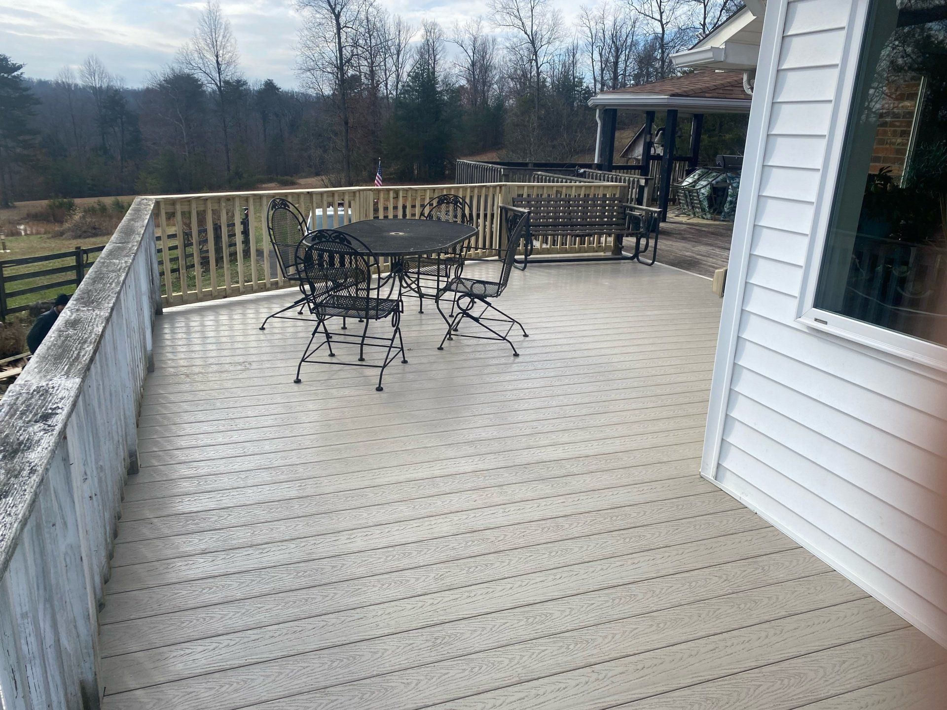 Trex Rocky Harbor decking with Westbury railing. Deck was built to fit under existing roof overhang, giving homeowners a nice retreat from sun and rain.
