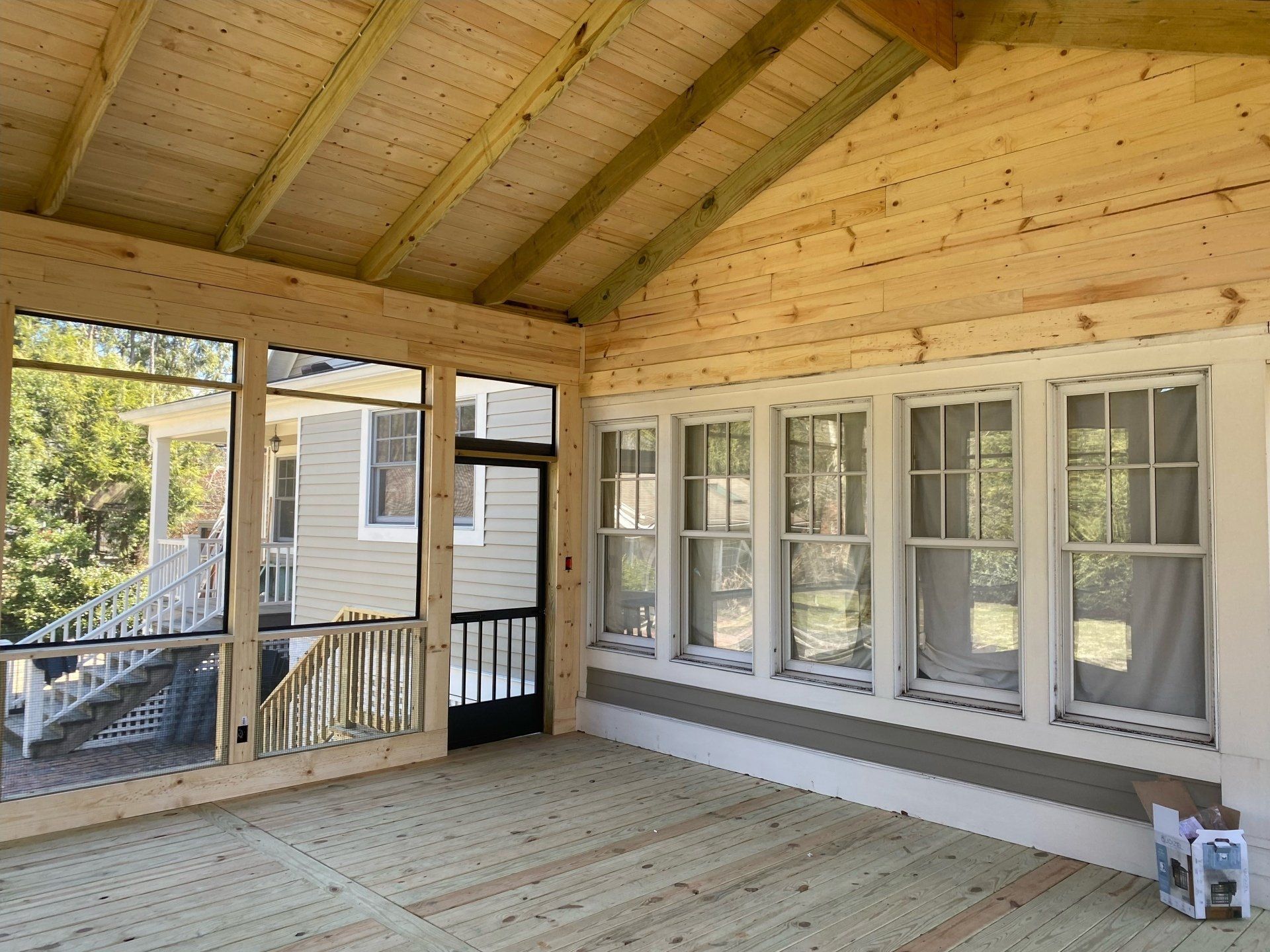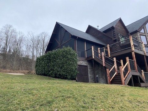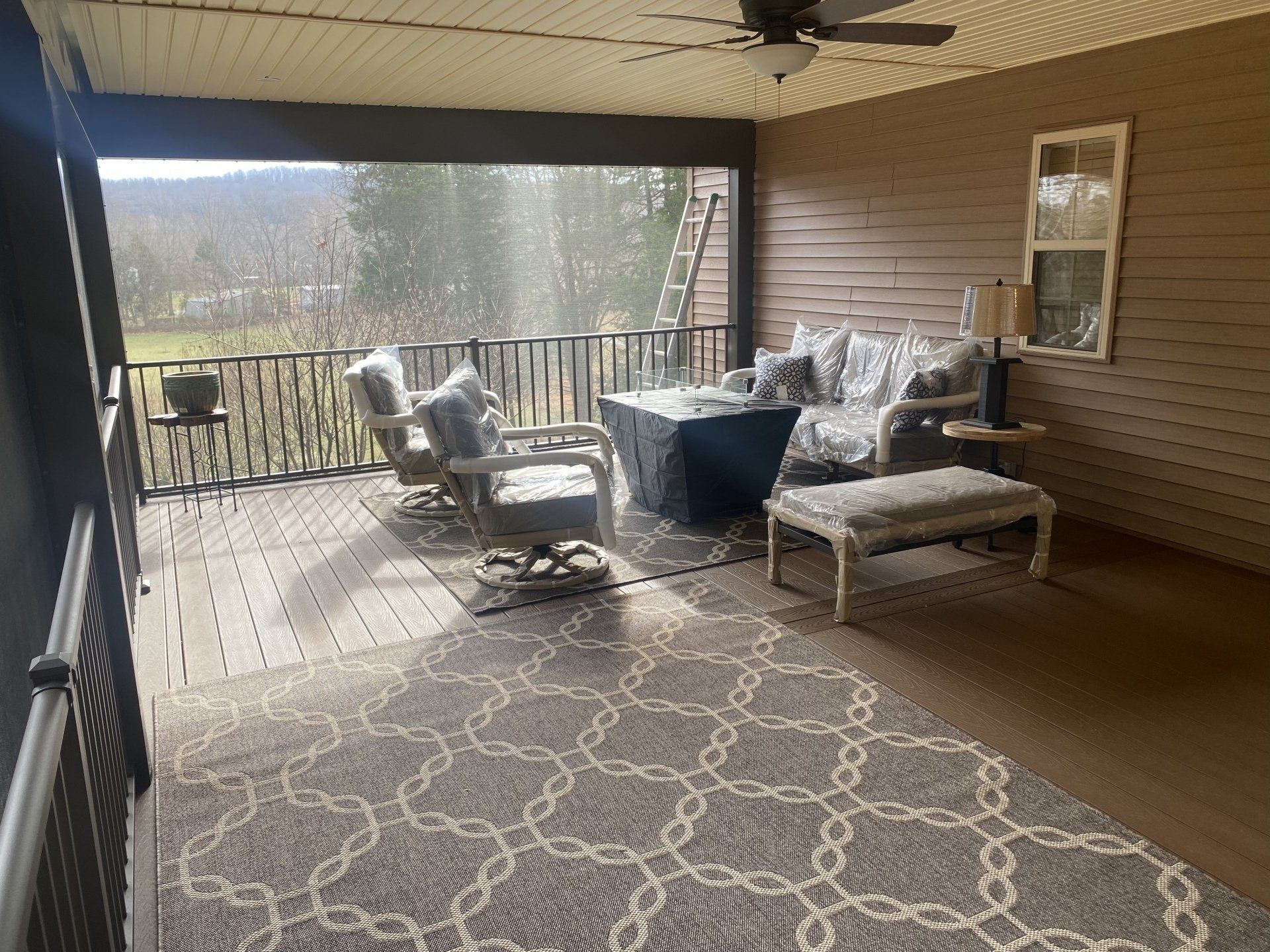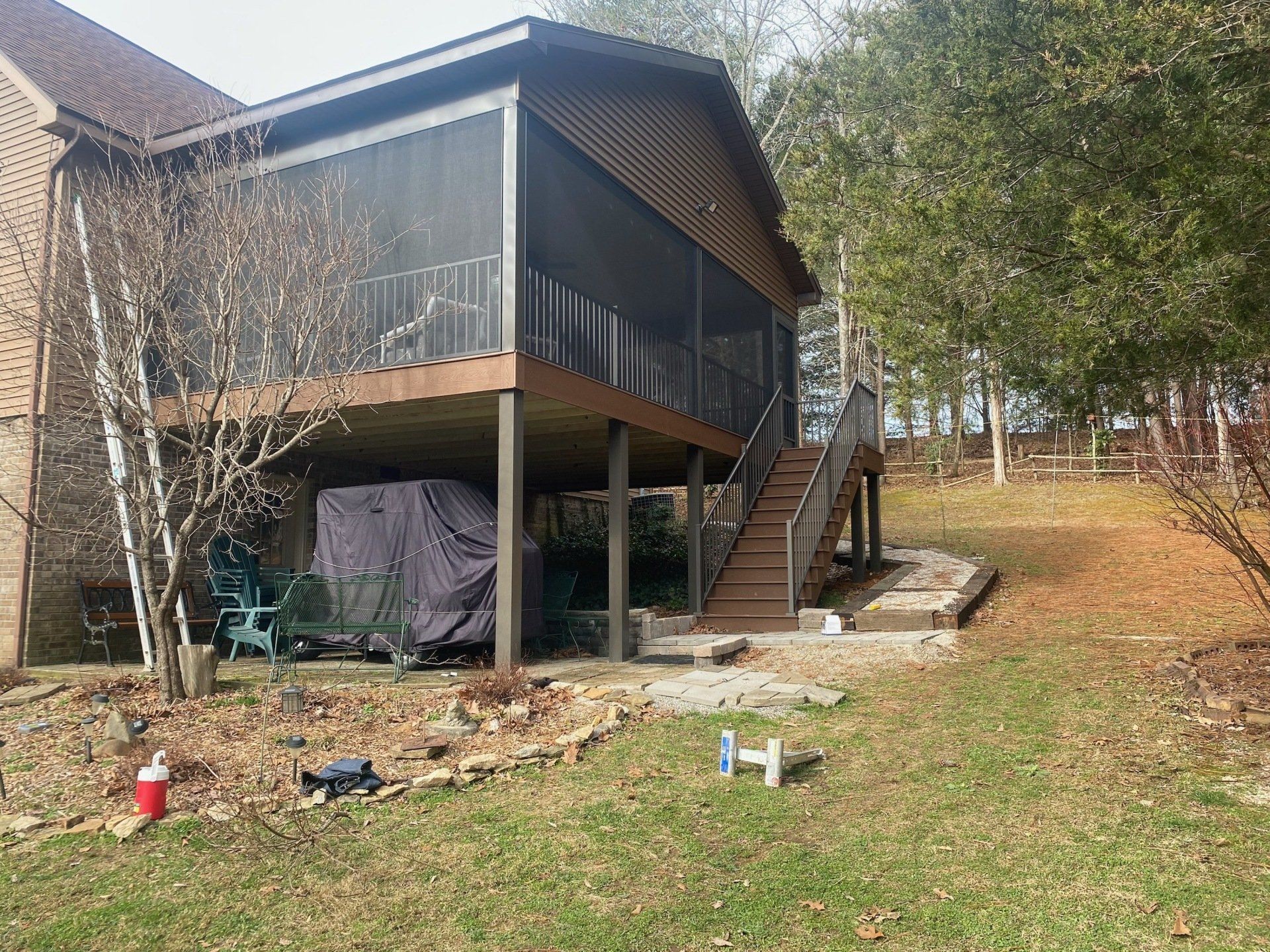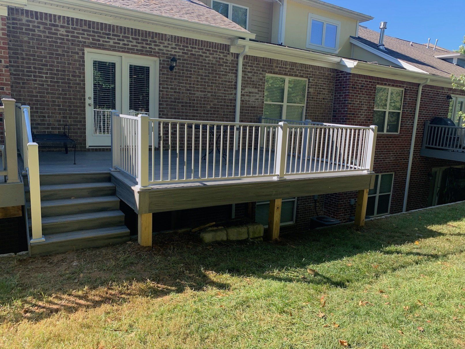 Deck and screened room in Locust Creek area of Louisville. Trex Toasted Sand decking with Westbury railing. Royal PVC post wrap.